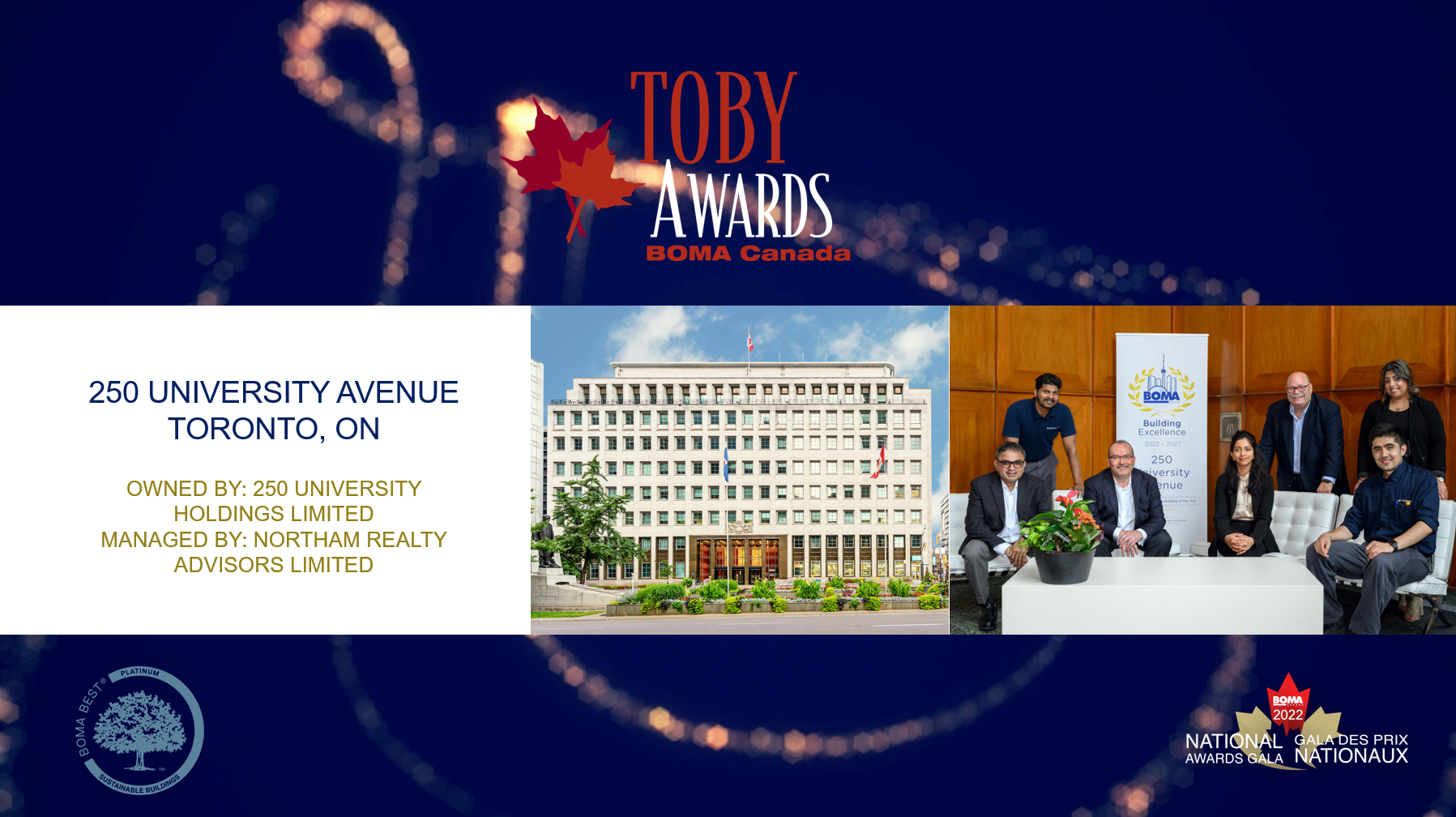 Thursday September 15, 2022, BOMA Canada hosted the National TOBY Awards Ceremony Gala, in Charlotteville PEI. We are pleased to announce that Northam Realty Advisors Limited won the National TOBY Award in the Historical Building category for 250 University Avenue. Neil Armstrong and his team will now move on in 2023 to compete in Kansas City at the international level for the prestigious International TOBY Award.